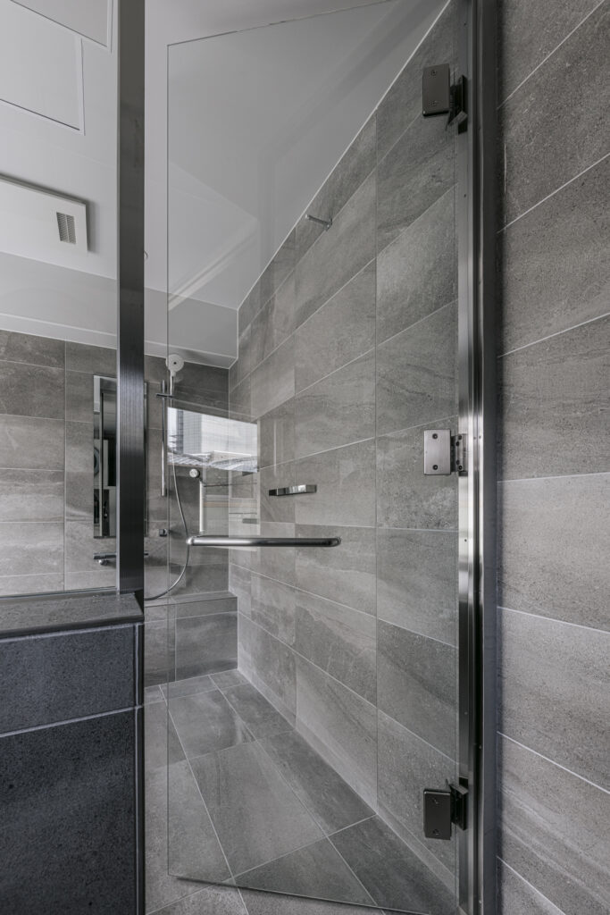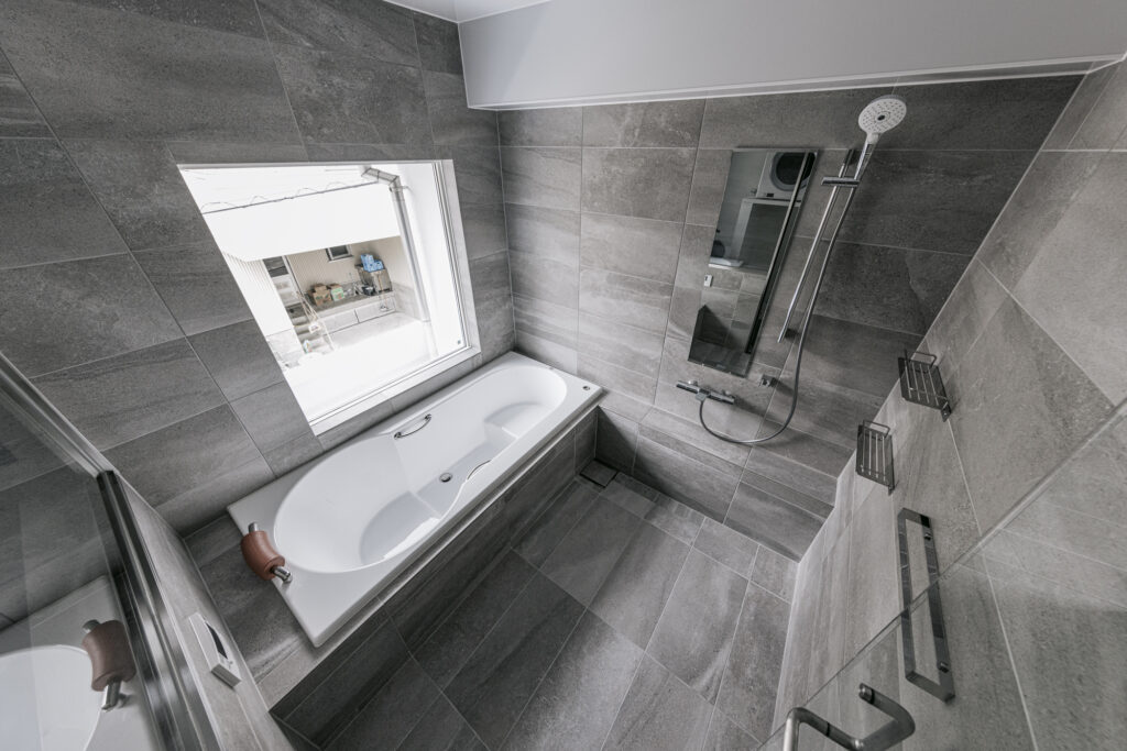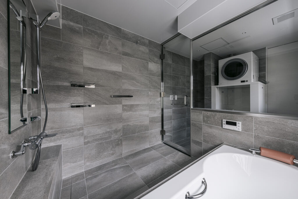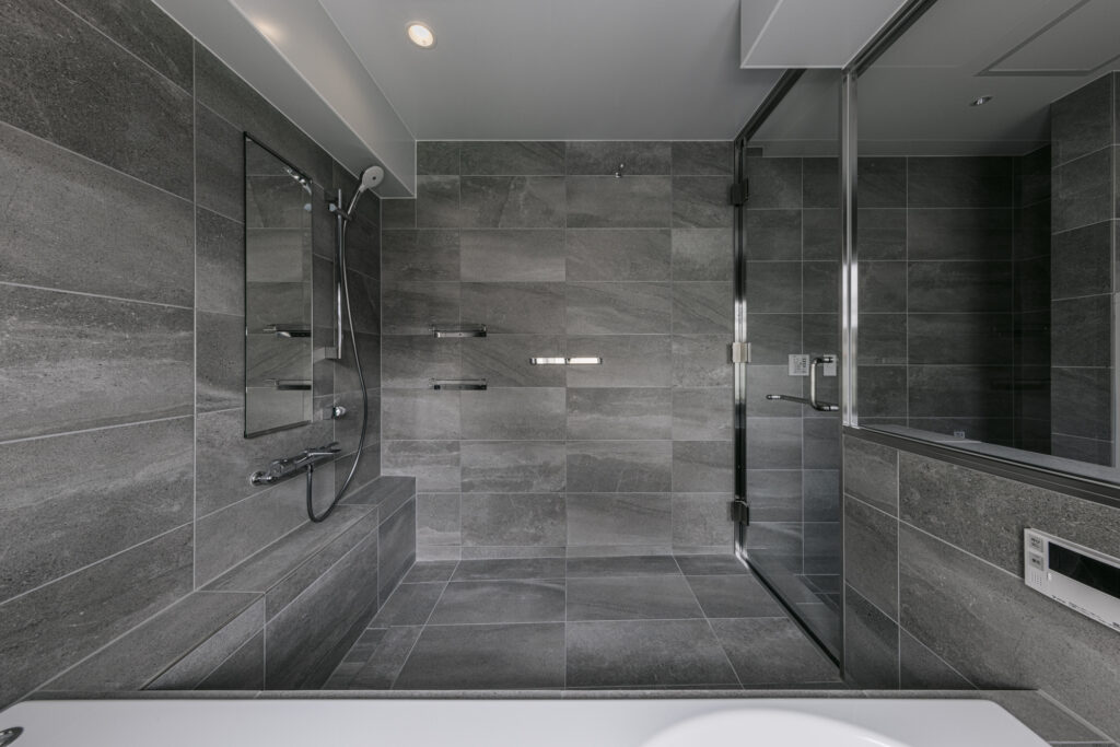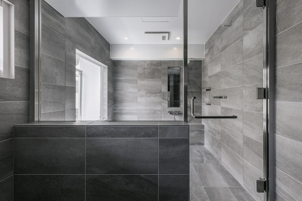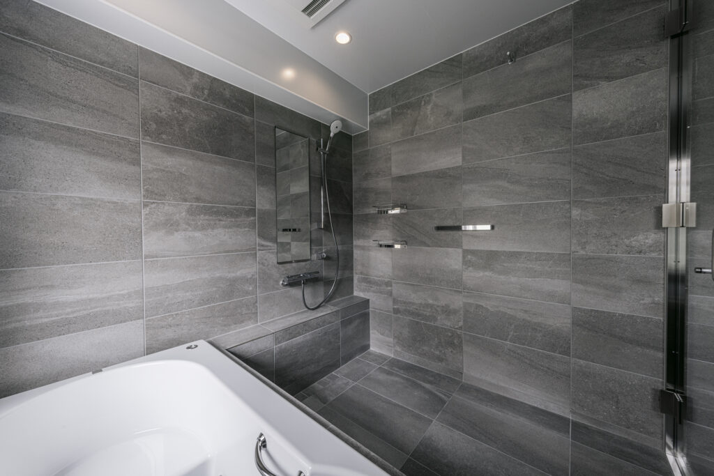 深みのあるグレータイルで壁と床を統一した、落ち着きあるモダンなバスルーム。大きな窓から差し込む自然光が重厚な質感をやわらげ、上質で心安らぐ時間を演出します。