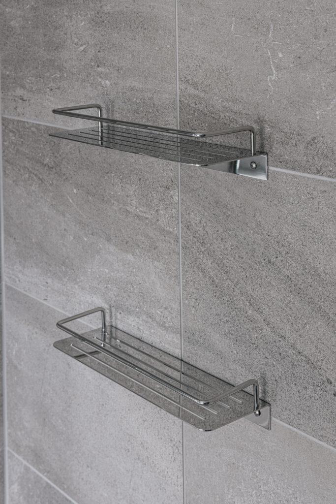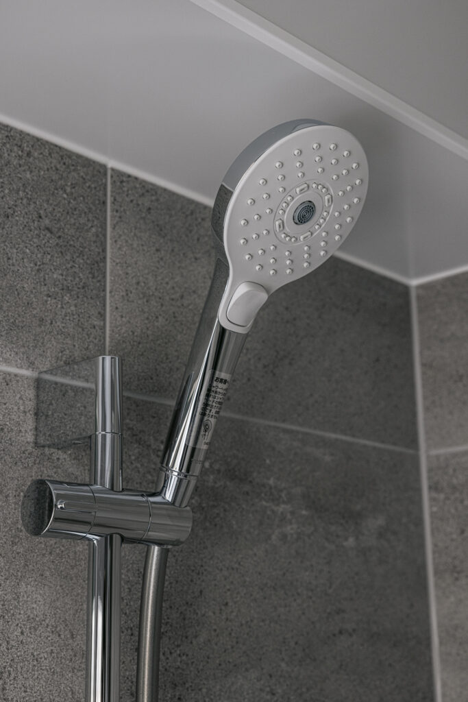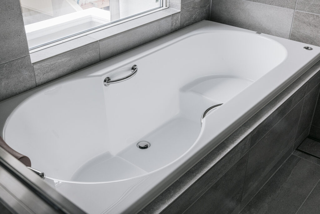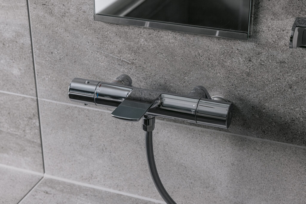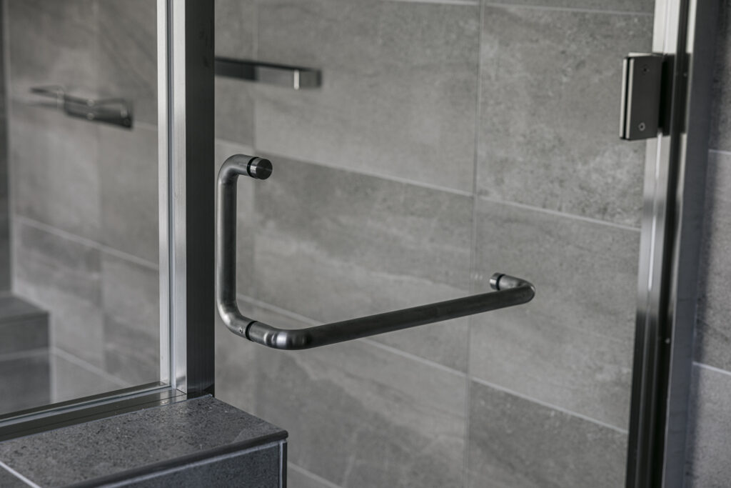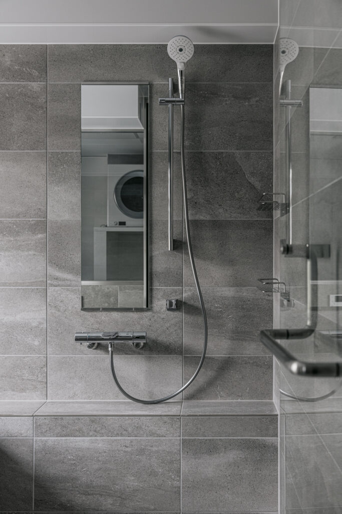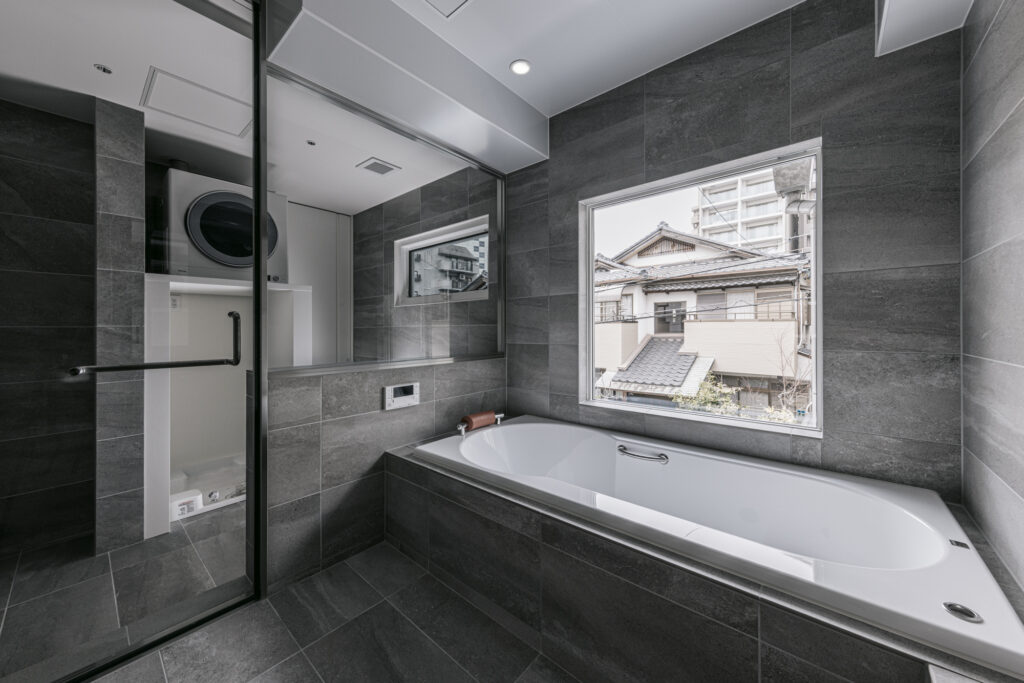 深みのあるグレータイルで壁と床を統一した、落ち着きあるモダンなバスルーム。大きな窓から差し込む自然光が重厚な質感をやわらげ、上質で心安らぐ時間を演出します。