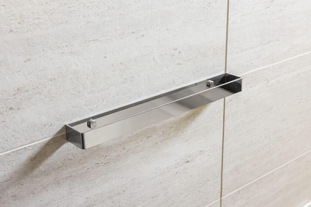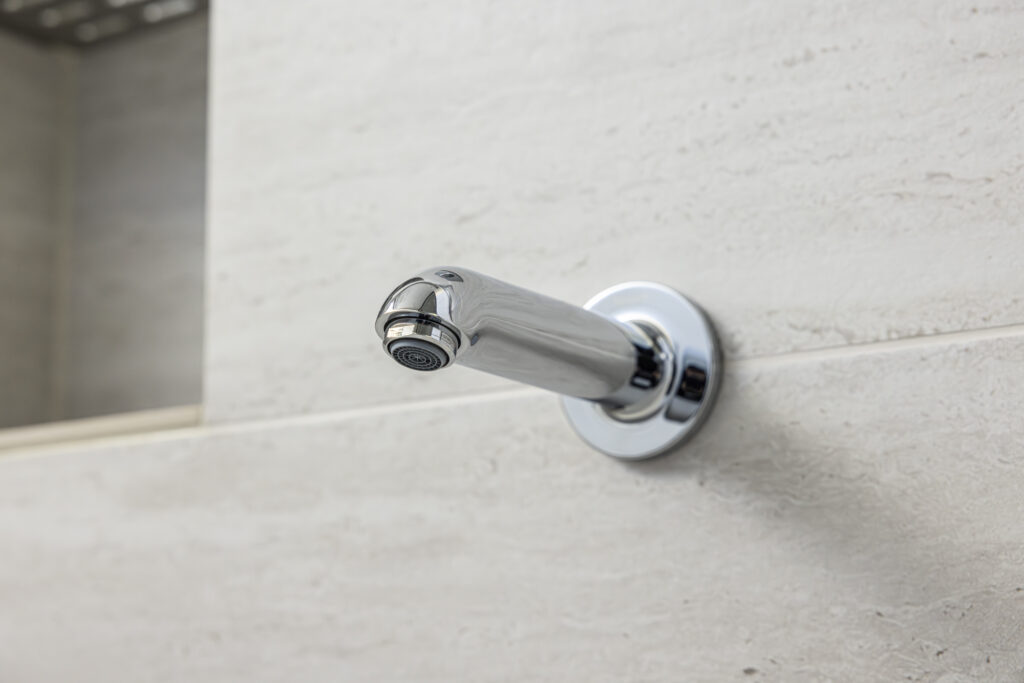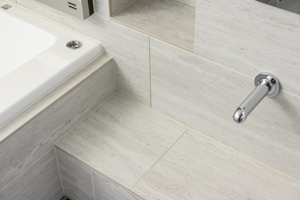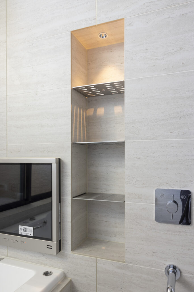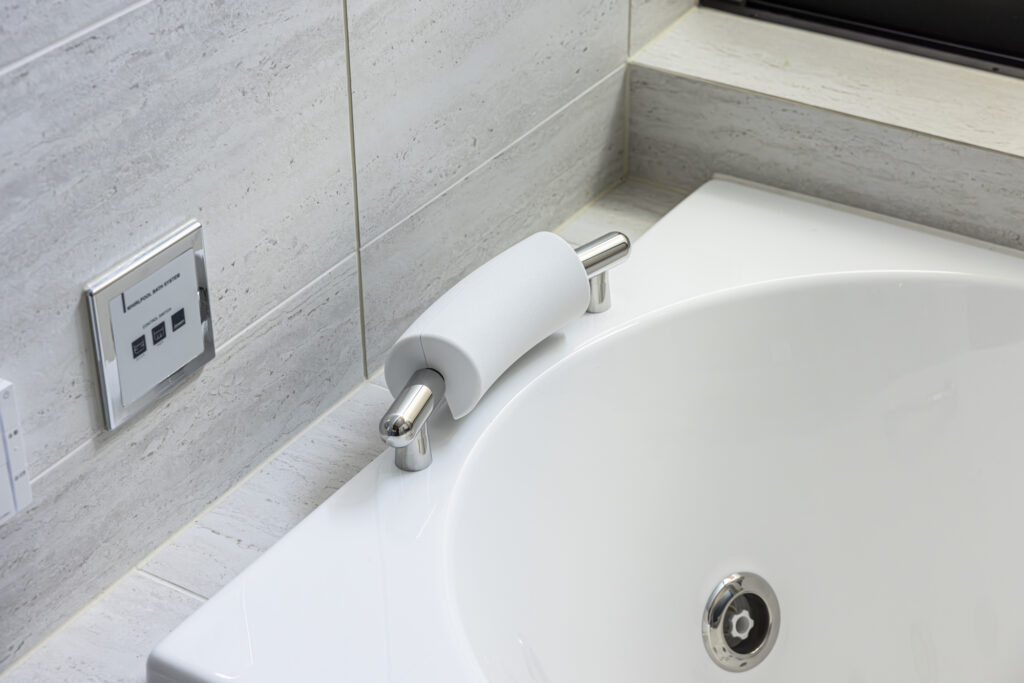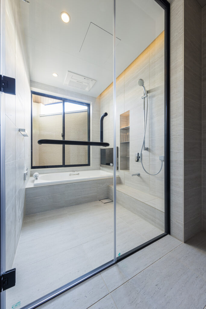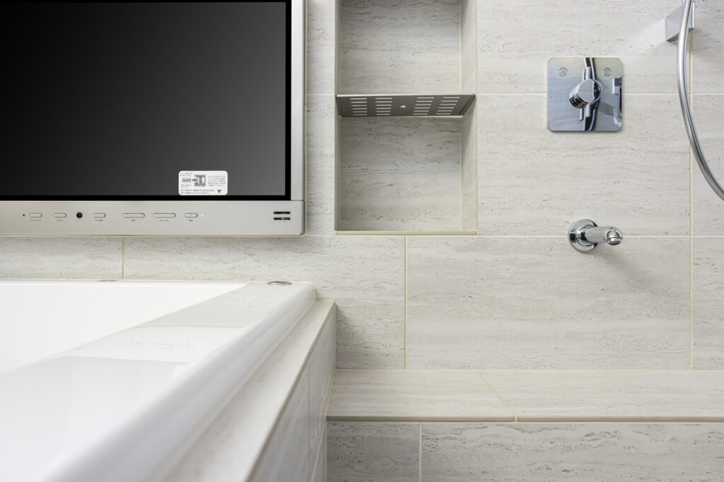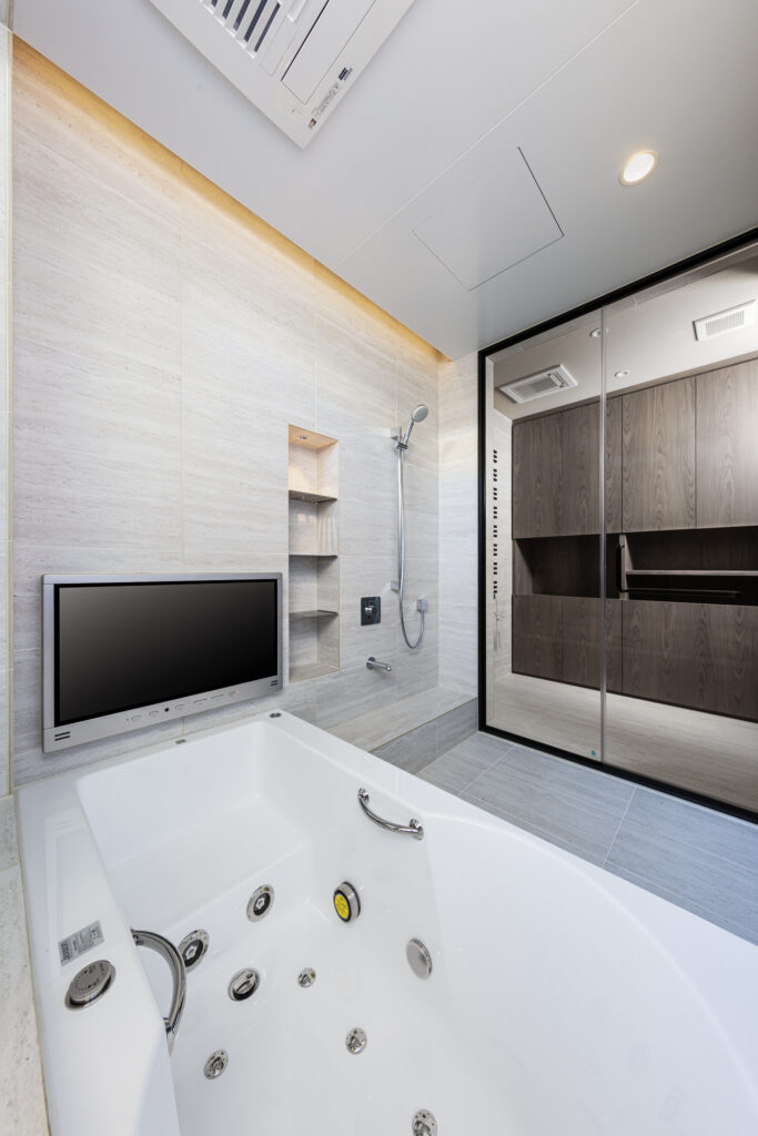 柔らかな淡いベージュの石調タイルが空間を包み込む、静けさを極めたバスルーム。余白を活かした設計と美しく納められた設備が、日常を忘れさせる上質な寛ぎの時間をもたらします。