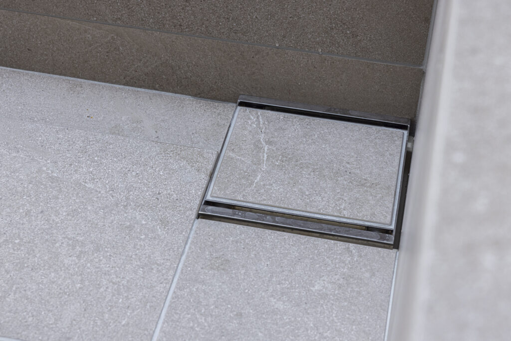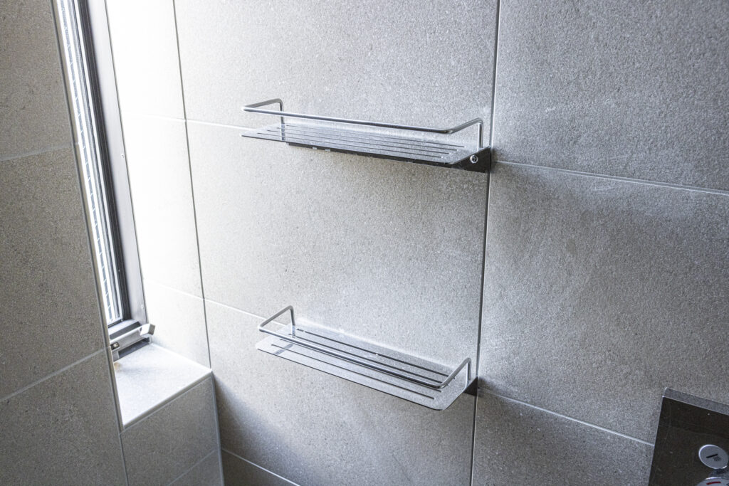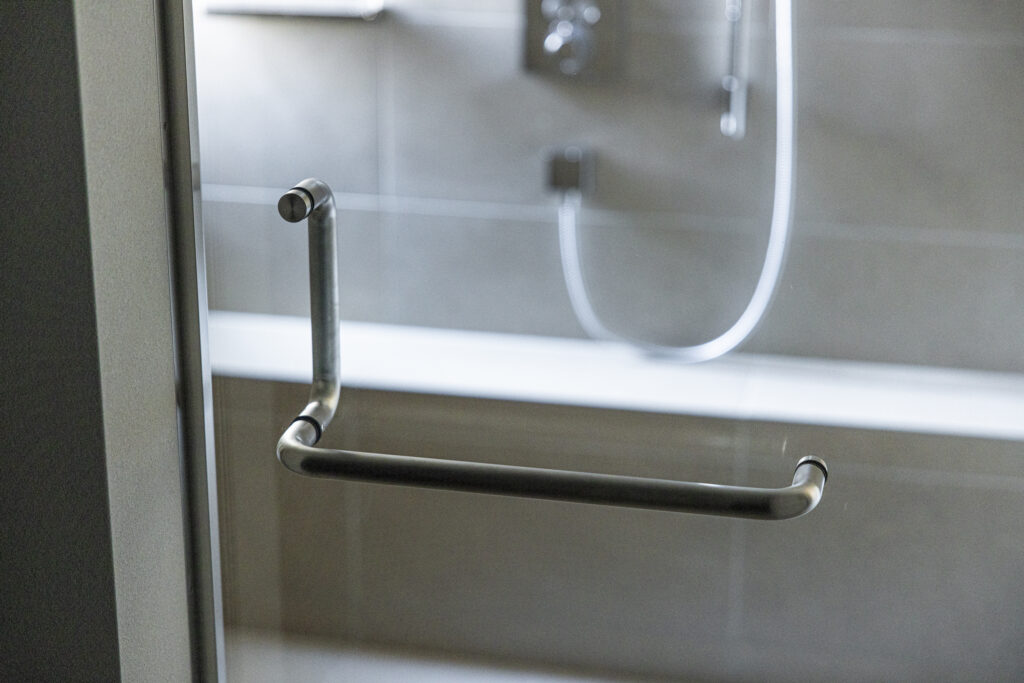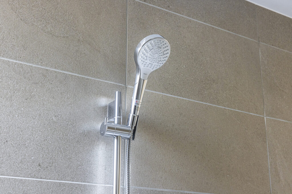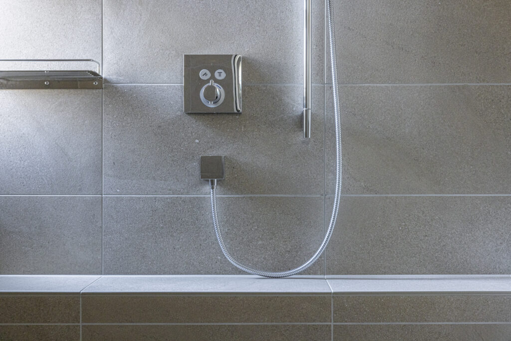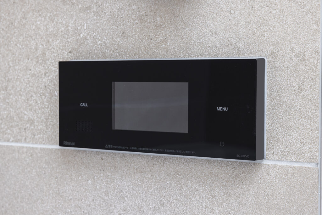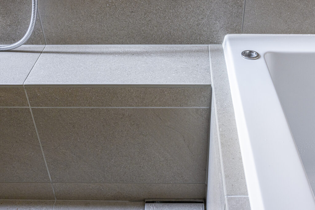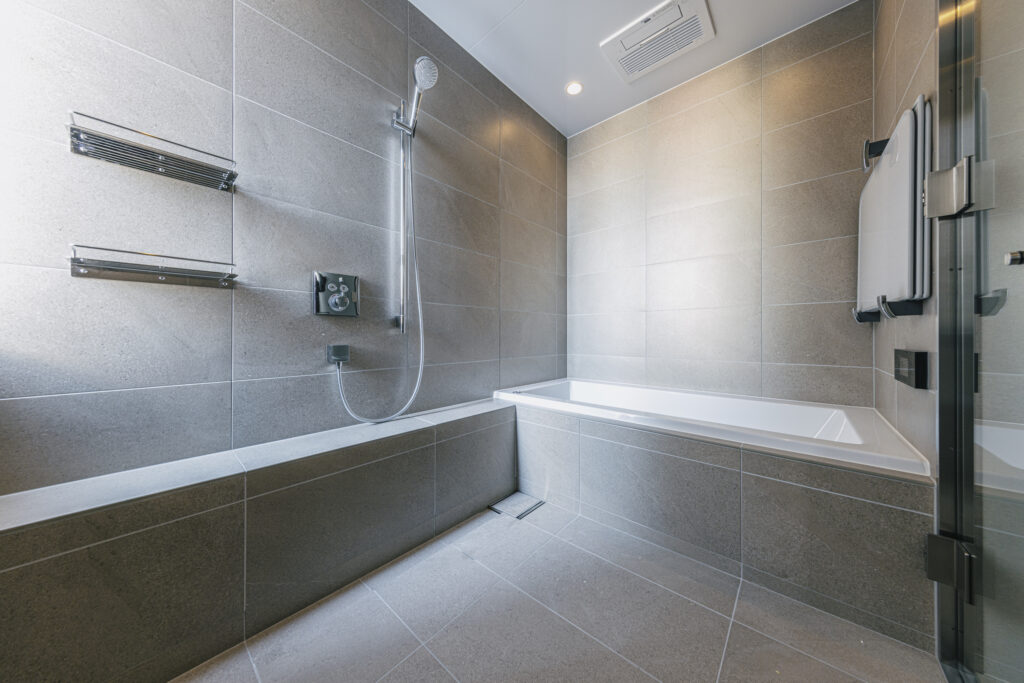 やわらかなベージュの大判タイルで包み込んだ空間に、控えめな照明が穏やかな奥行きを演出。凛とした佇まいの中で、ゆったりと自分を整える時間を愉しめる浴室です。