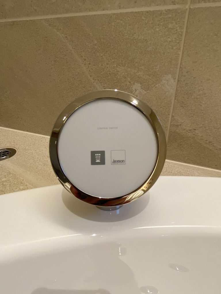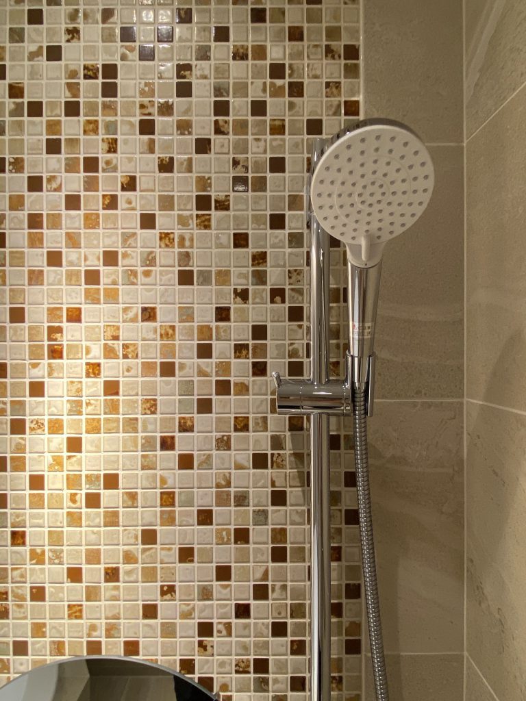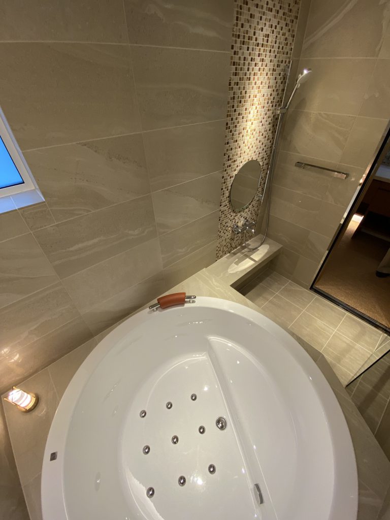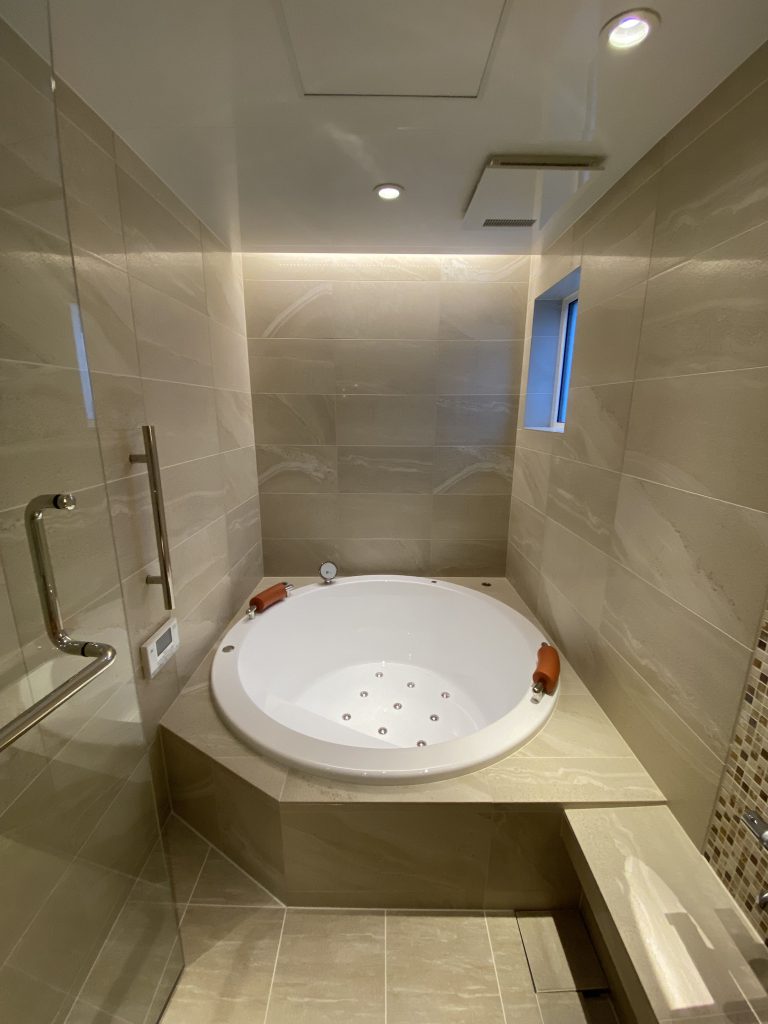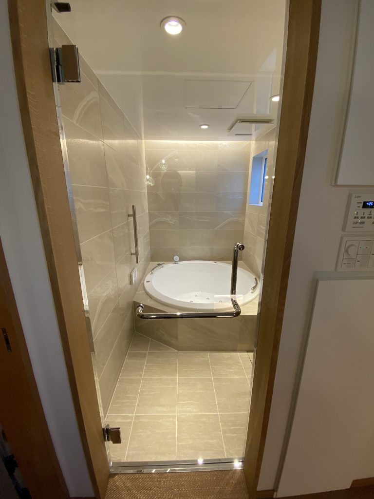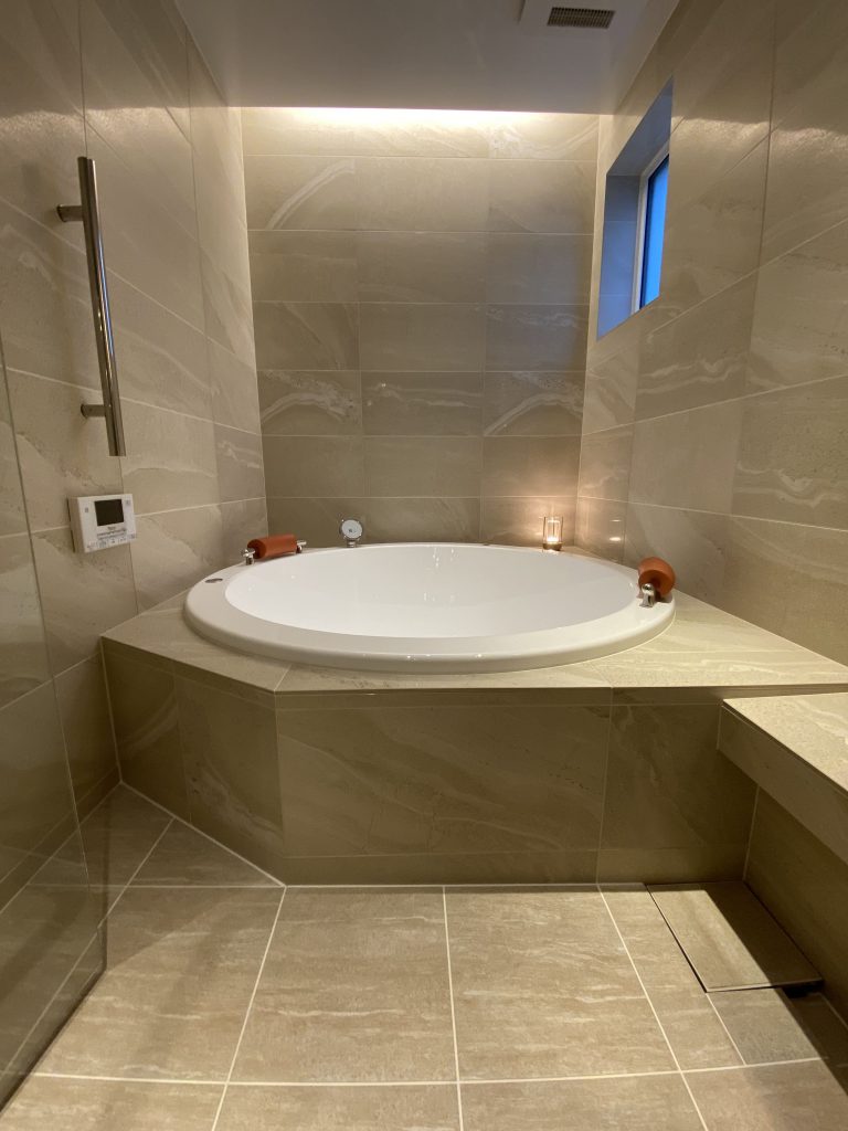 端正なフォルムの特注ユニットバスを軸に、素材の質感が豊かに響き合う構成。マットな壁面と光沢のある床パネルのコントラストが、空間に奥行きを生みます。凹凸の少ない洗練されたラインが視覚的にも心地よく、落ち着いた色調が毎日の入浴時間に静かな贅沢を添えます。