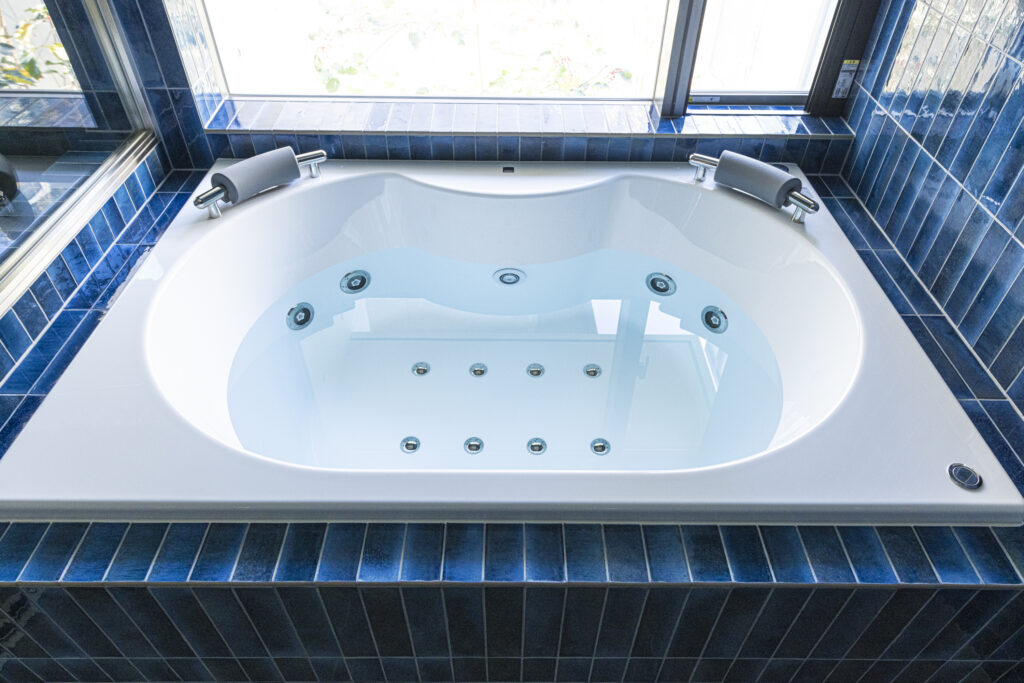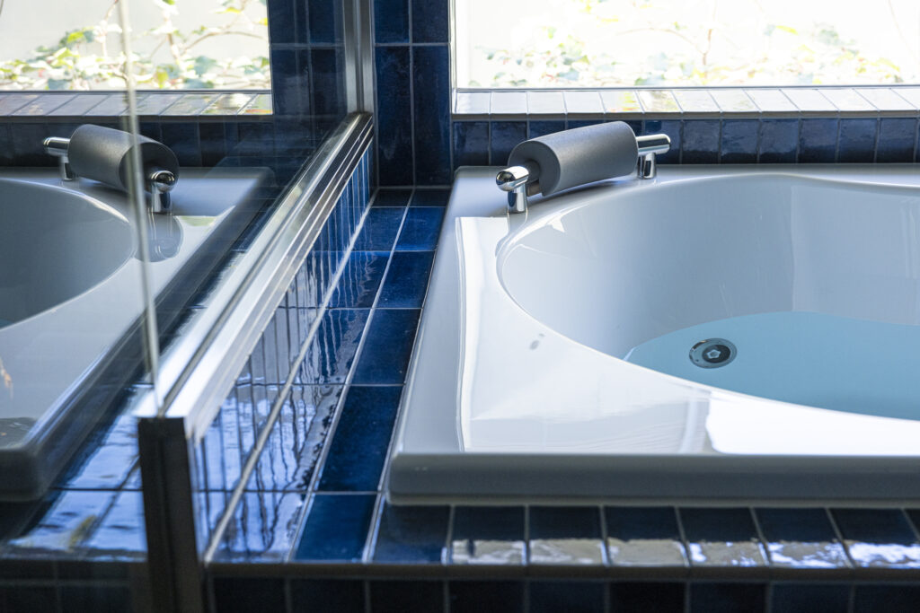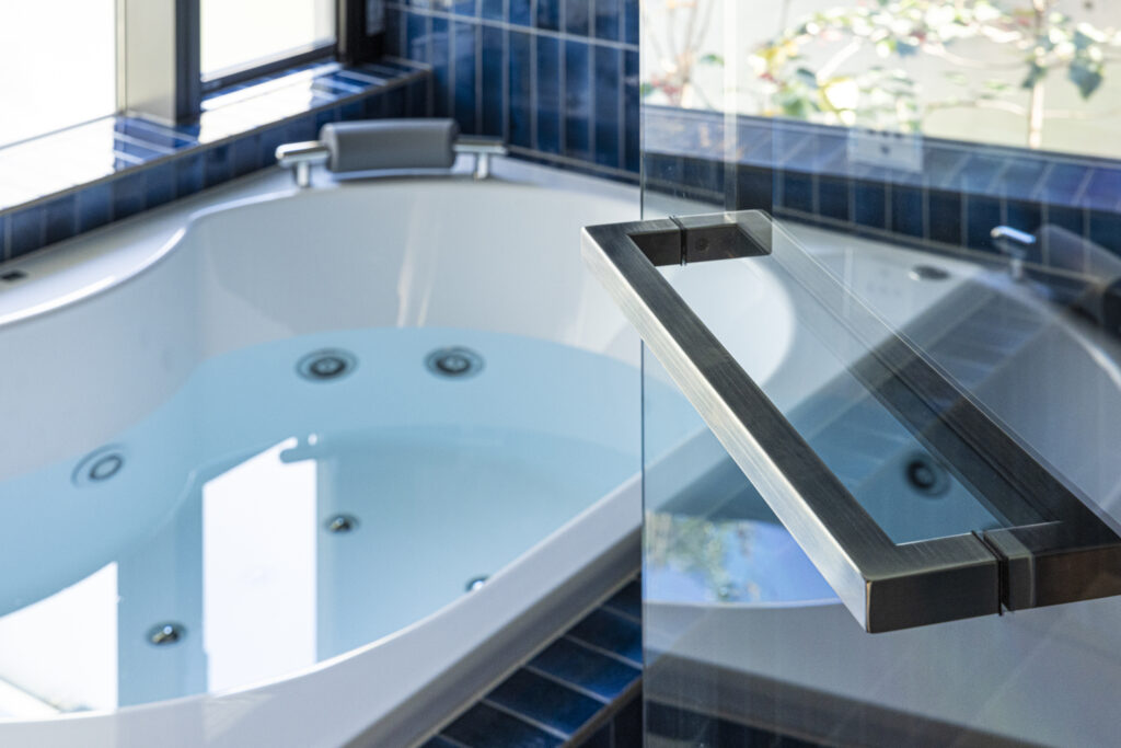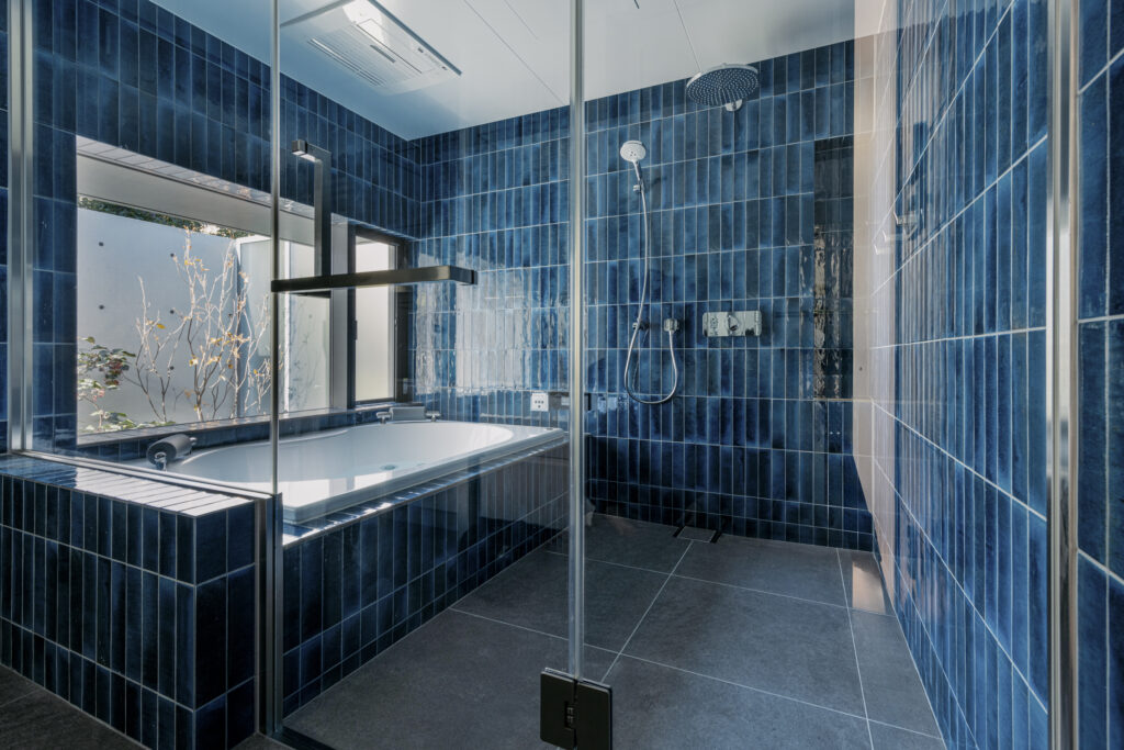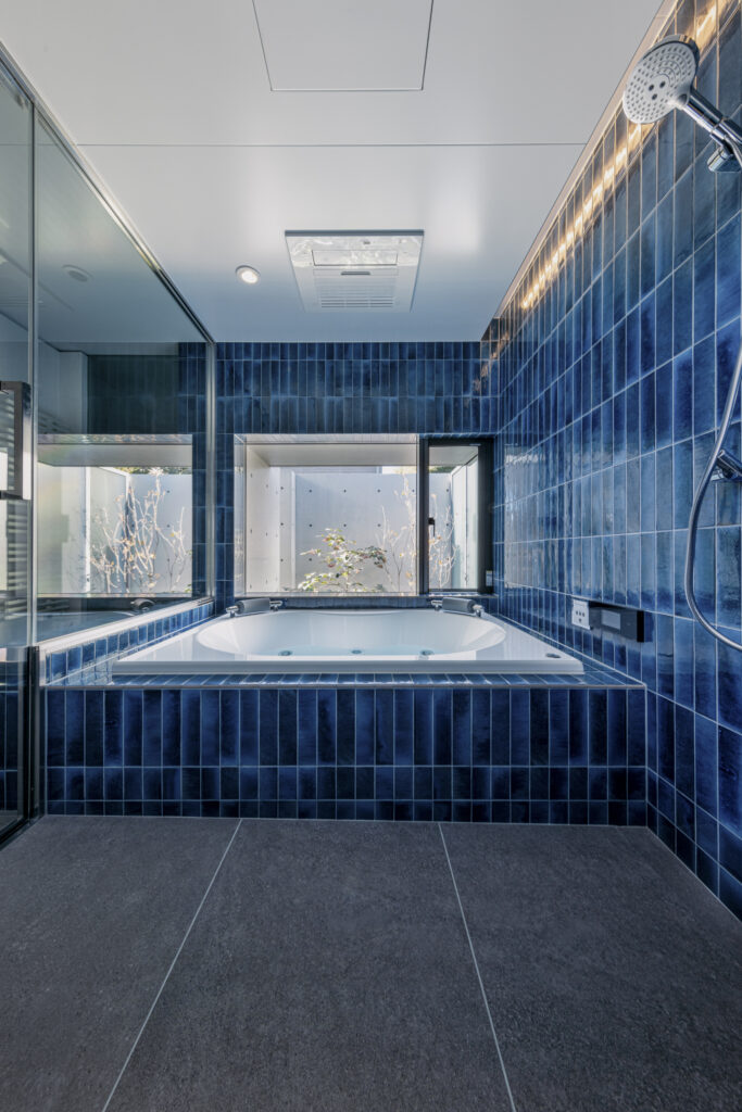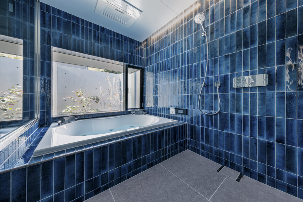 深い青のタイルが壁一面を包み込み、まるでリゾートのような世界観を演出する新築住宅のバスルーム。ジェットバスと間接照明が、日常を忘れる贅沢なひとときをもたらします。