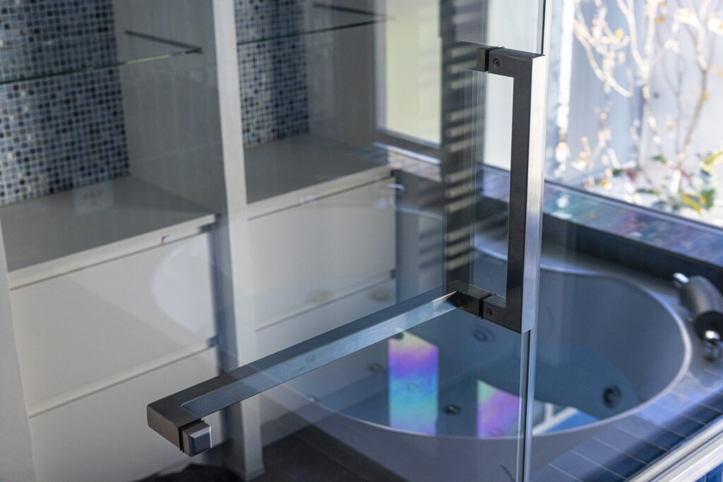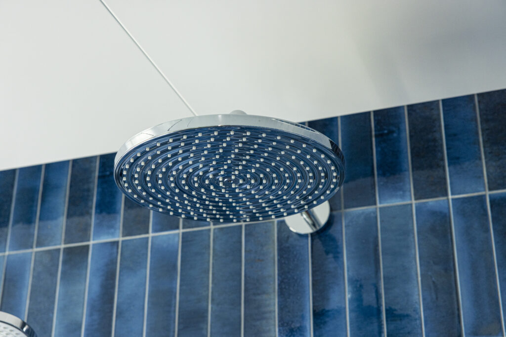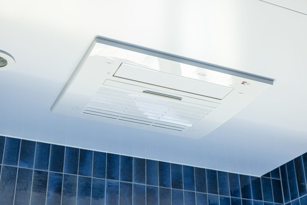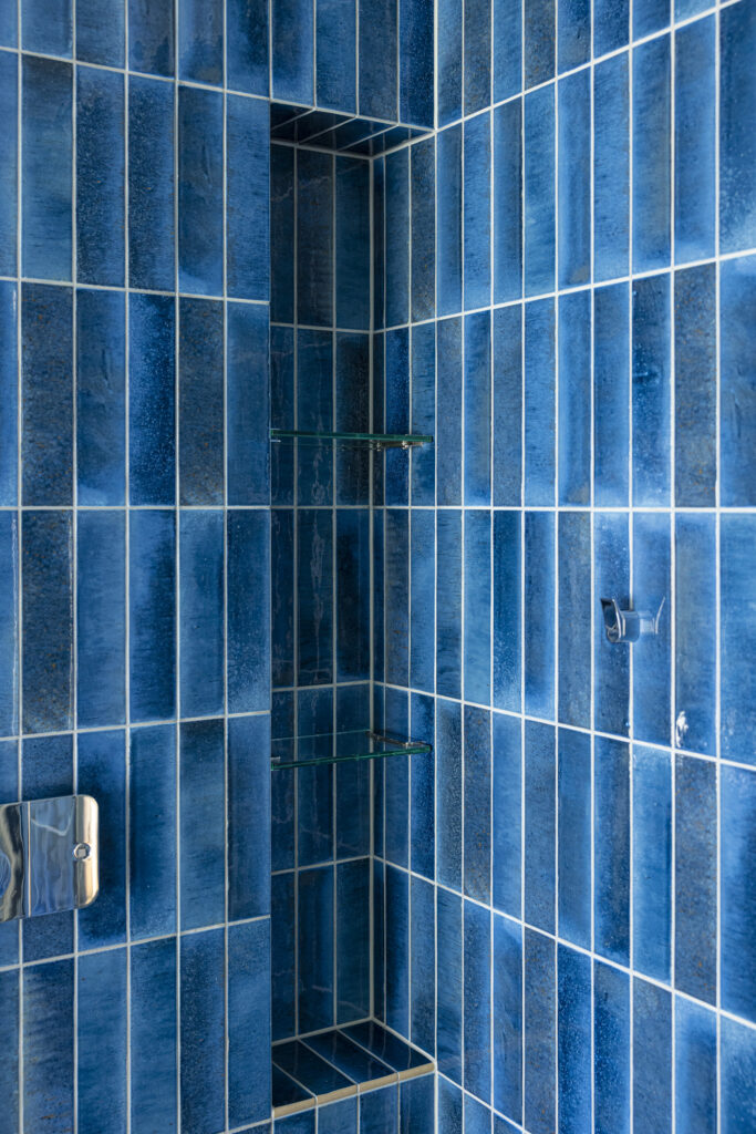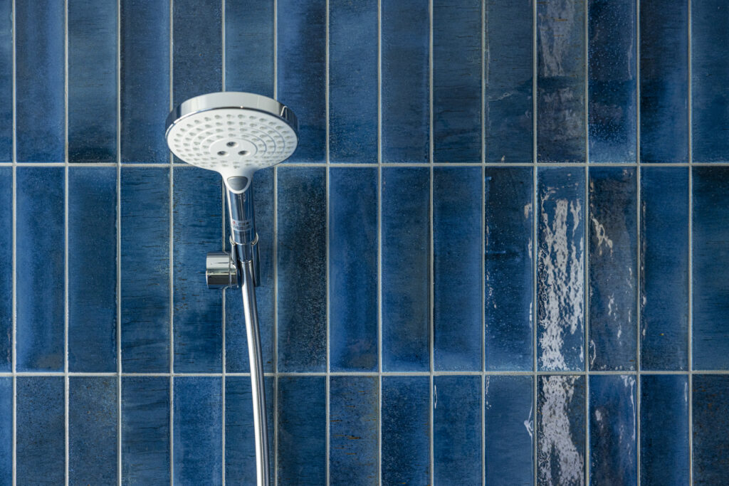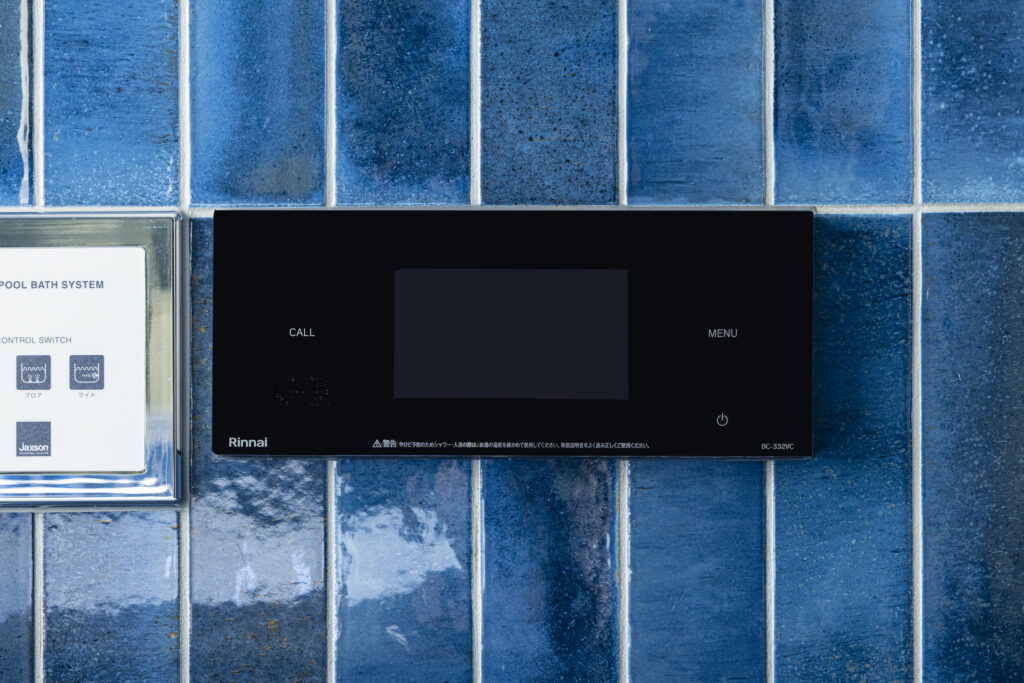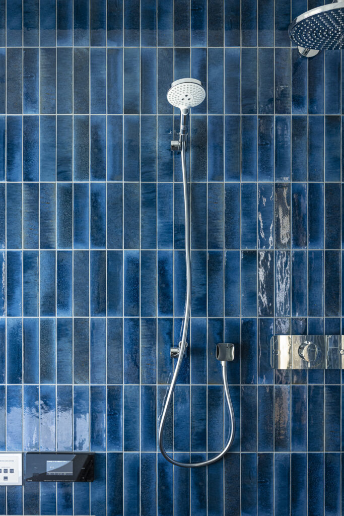 深い青のタイルが壁一面を包み込み、まるでリゾートのような世界観を演出する新築住宅のバスルーム。ジェットバスと間接照明が、日常を忘れる贅沢なひとときをもたらします。