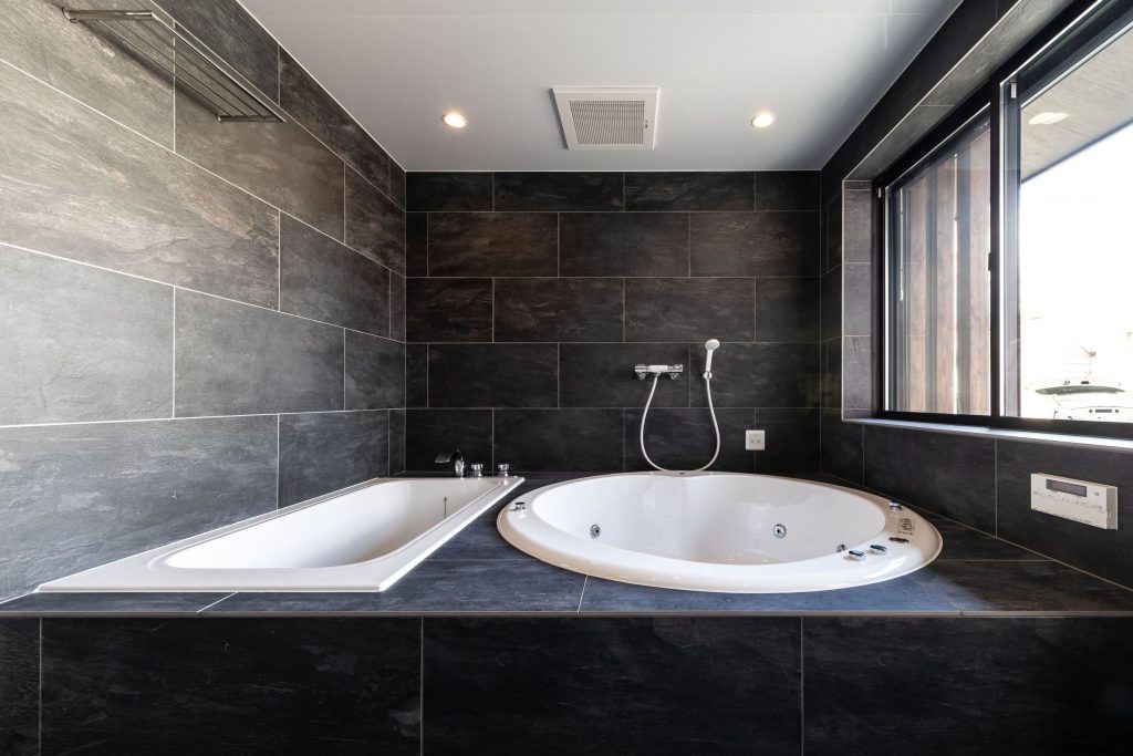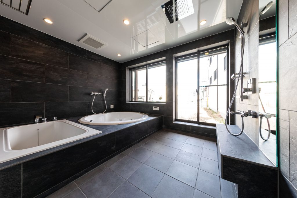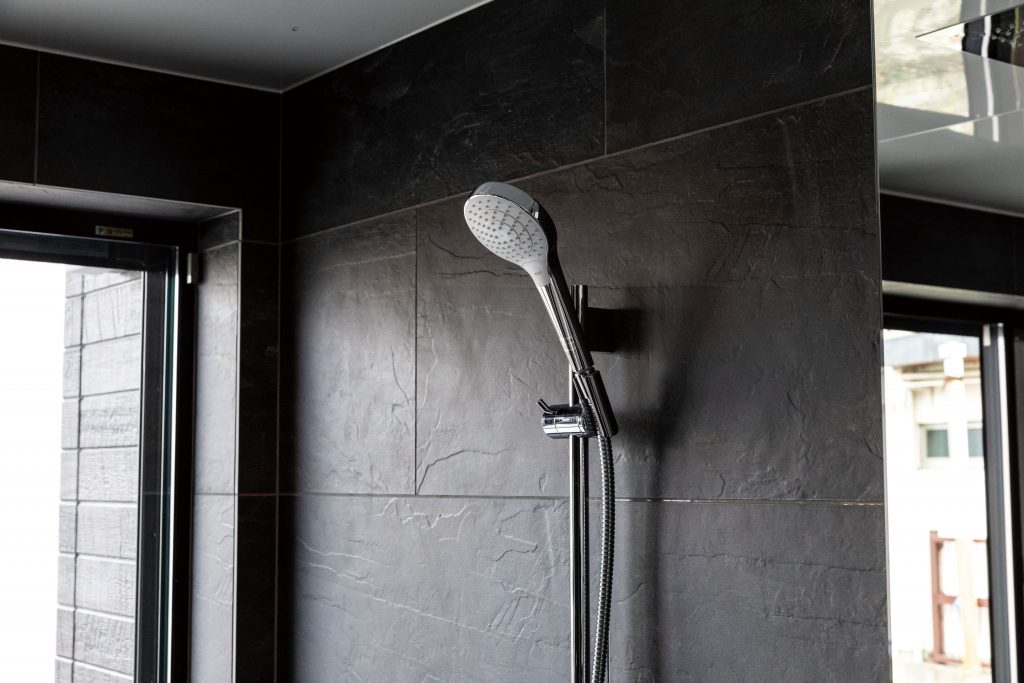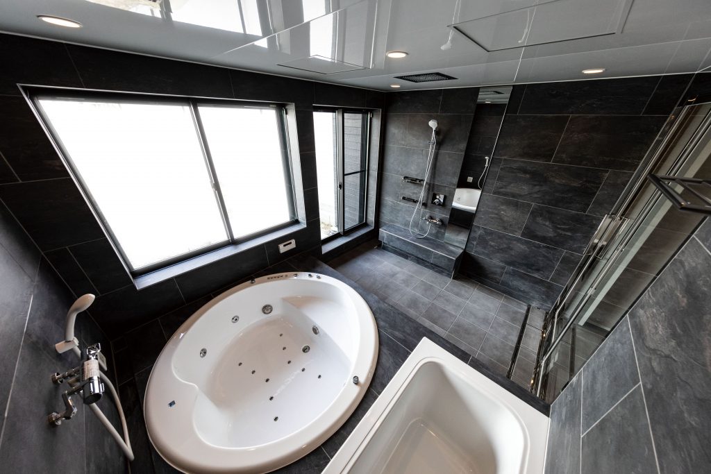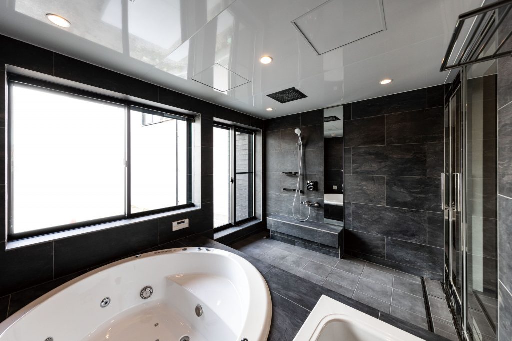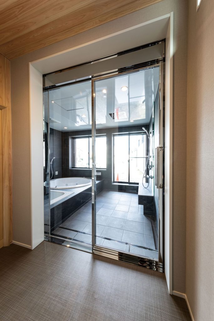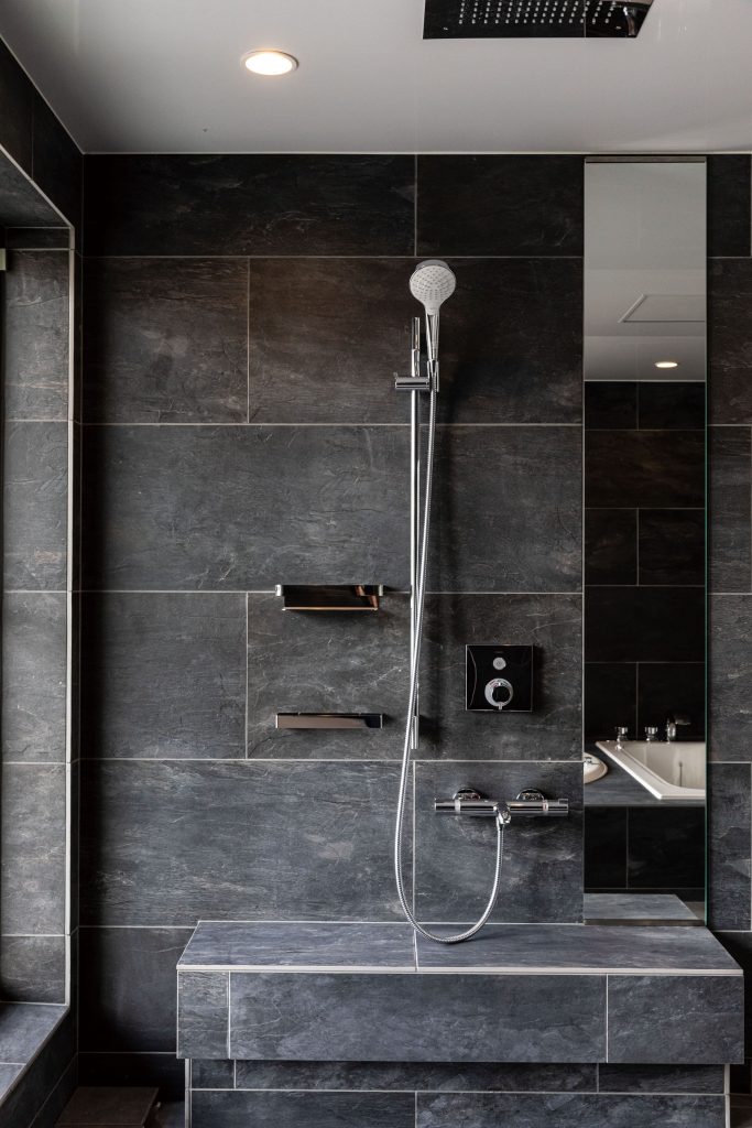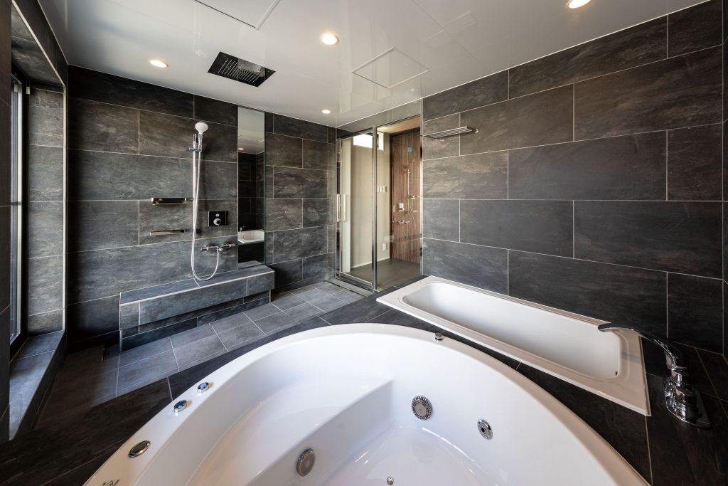 落ち着いた色調のパネルに、素材の質感が静かに映えるバスルーム空間。穏やかな陰影を描く壁面と、やわらかな光を受けた床の繊細なテクスチャが調和し、視線を心地よく導きます。上質な素材選びと計算された設えが、日々のひとときに静かな贅沢とやすらぎをもたらす特別な時間を演出します。