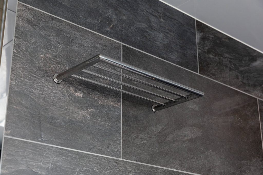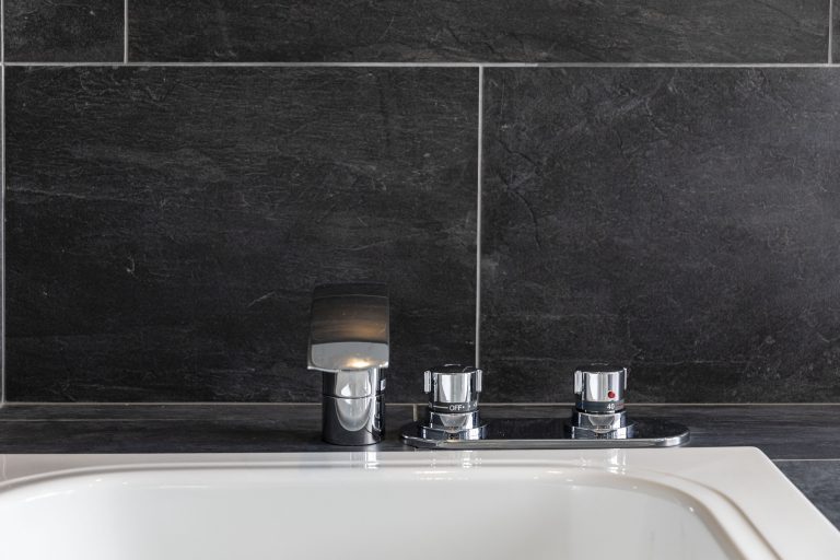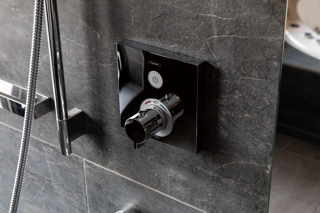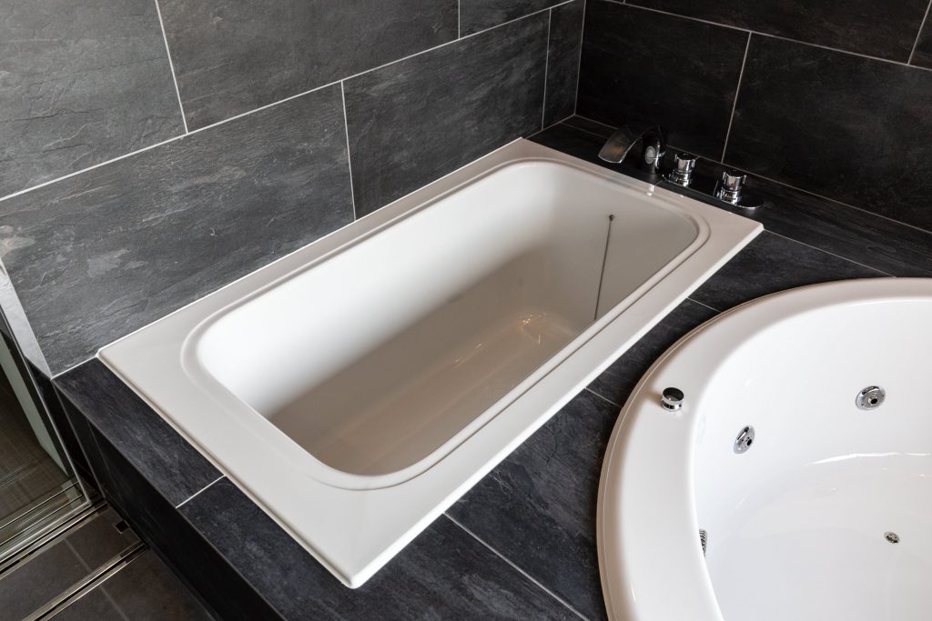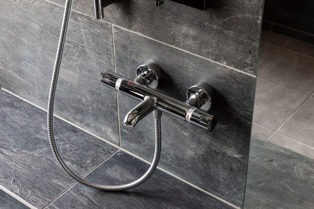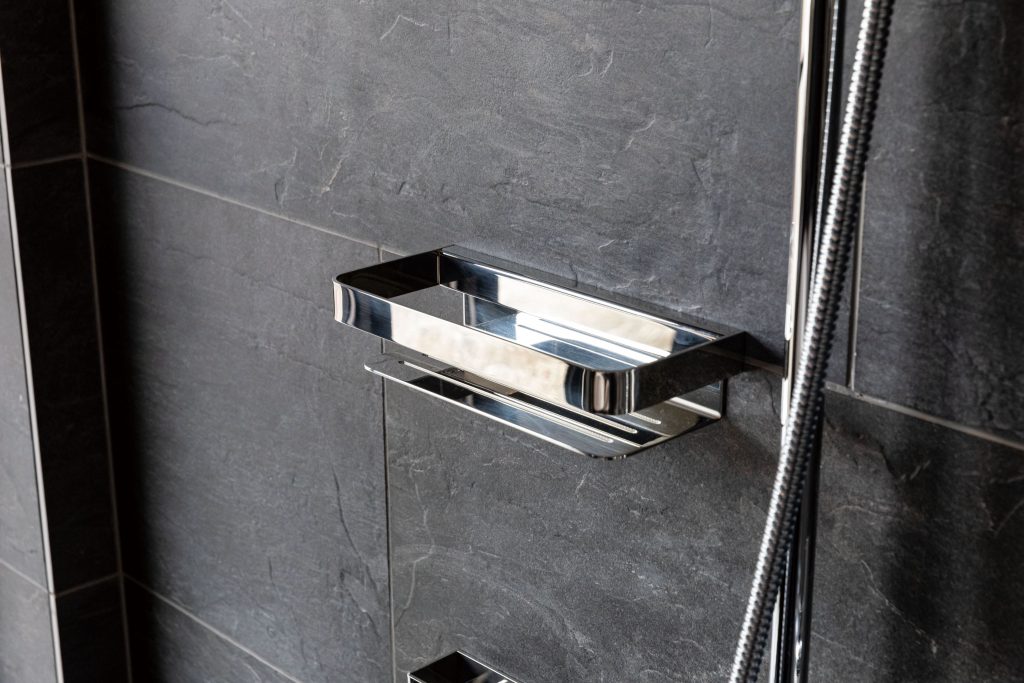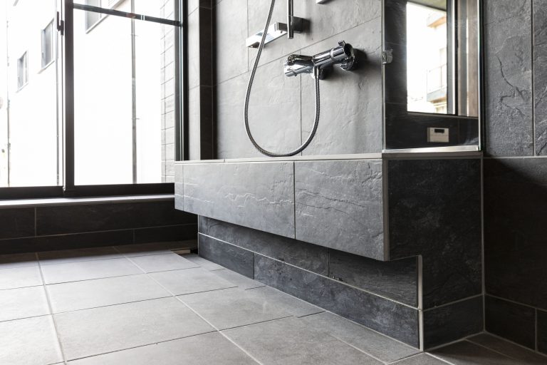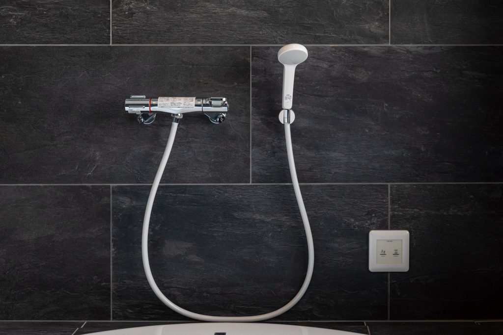 落ち着いた色調のパネルに、素材の質感が静かに映えるバスルーム空間。穏やかな陰影を描く壁面と、やわらかな光を受けた床の繊細なテクスチャが調和し、視線を心地よく導きます。上質な素材選びと計算された設えが、日々のひとときに静かな贅沢とやすらぎをもたらす特別な時間を演出します。