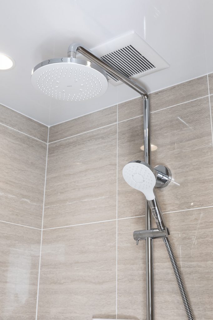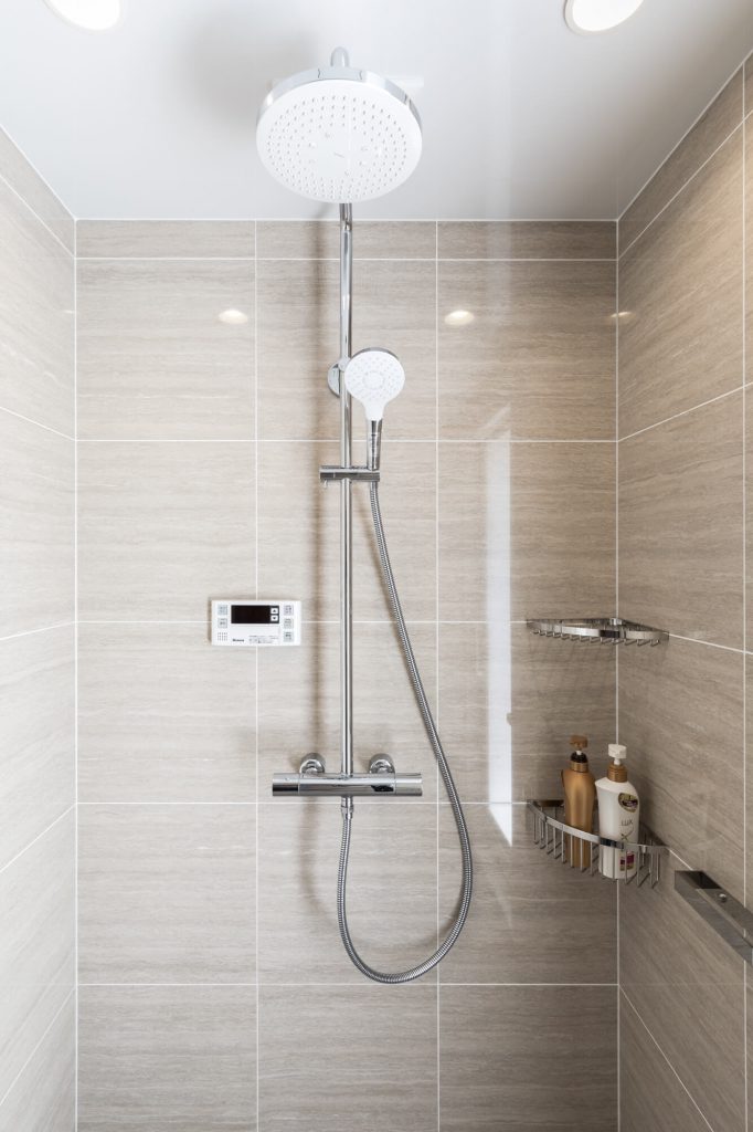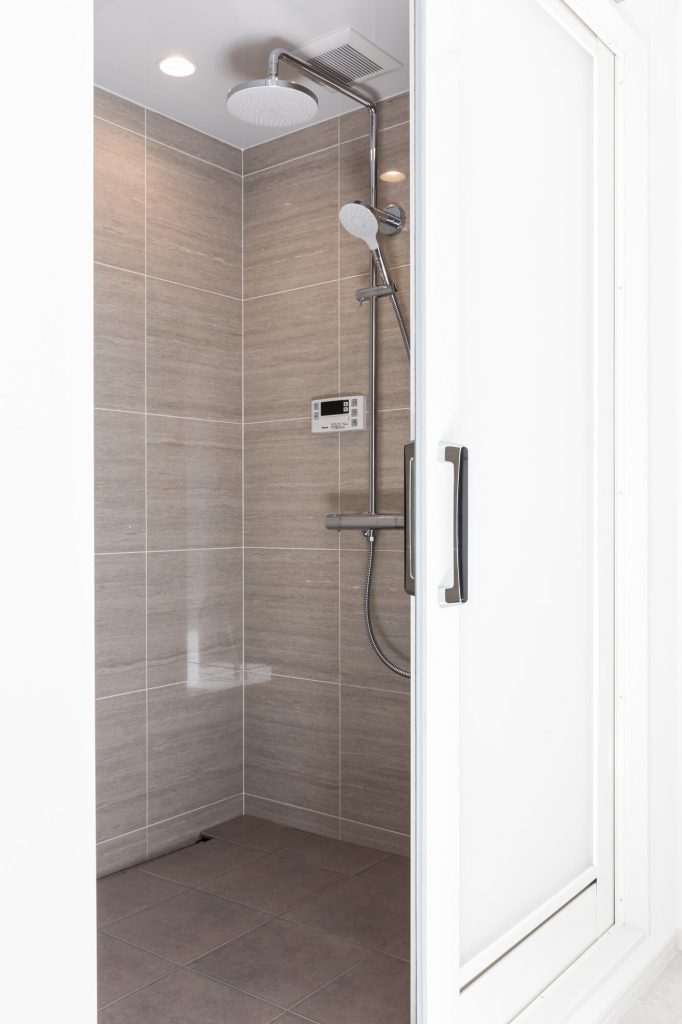 ホワイトの石目調タイルをベースに、穏やかな色味の床素材を組み合わせることで、視覚的にも触覚的にも心地よい空間を実現しました。シンプルなフォルムは余計な装飾をそぎ落としつつ、素材の質感とラインの美しさが日常のシャワータイムを上質なリセットの時間へと誘います。