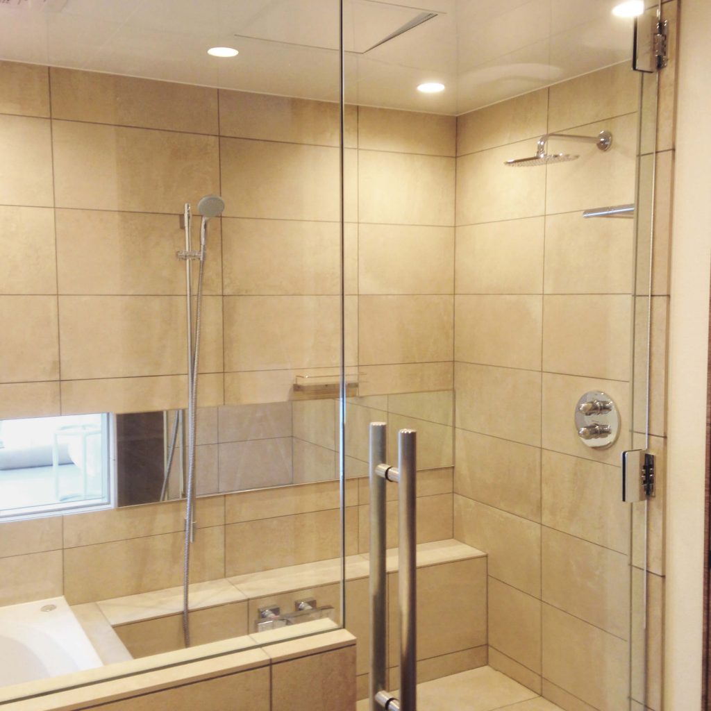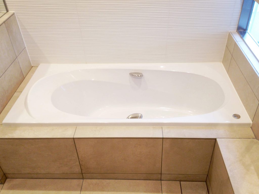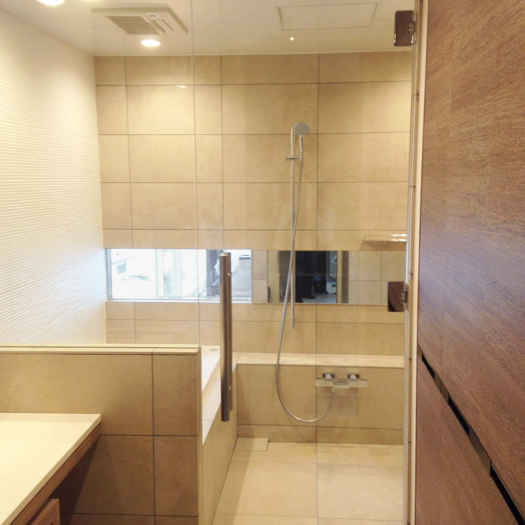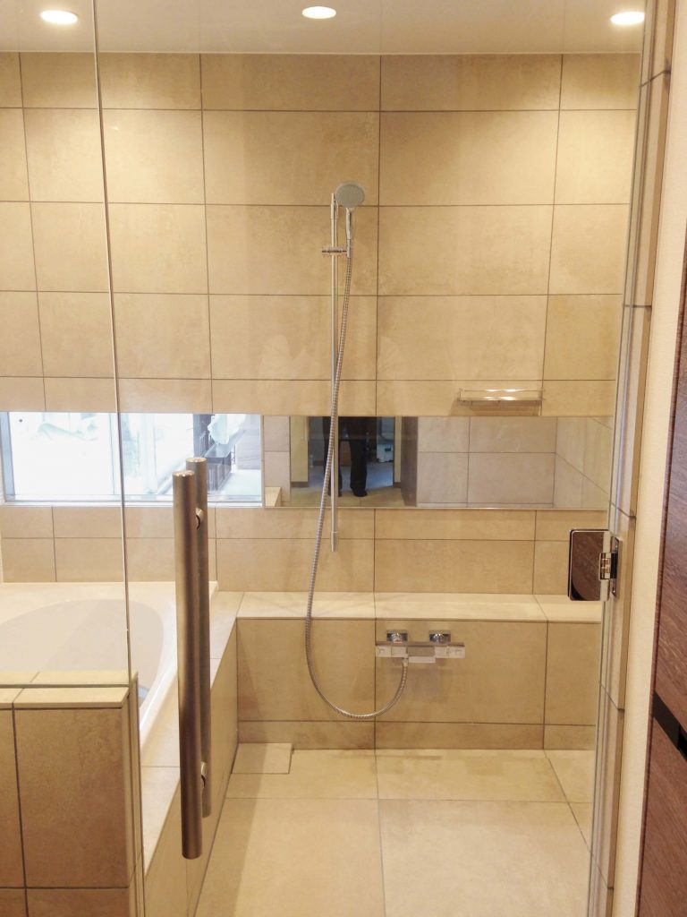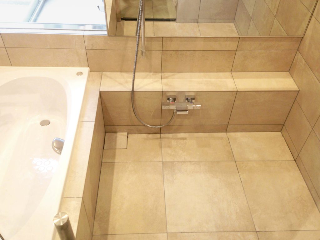 大判タイルの面の美しさと静かな奥行きに包まれ、ゆるやかに時が流れる、落ち着きあるバスルーム