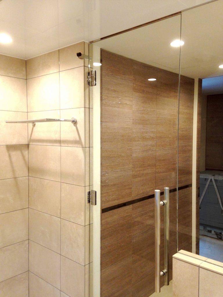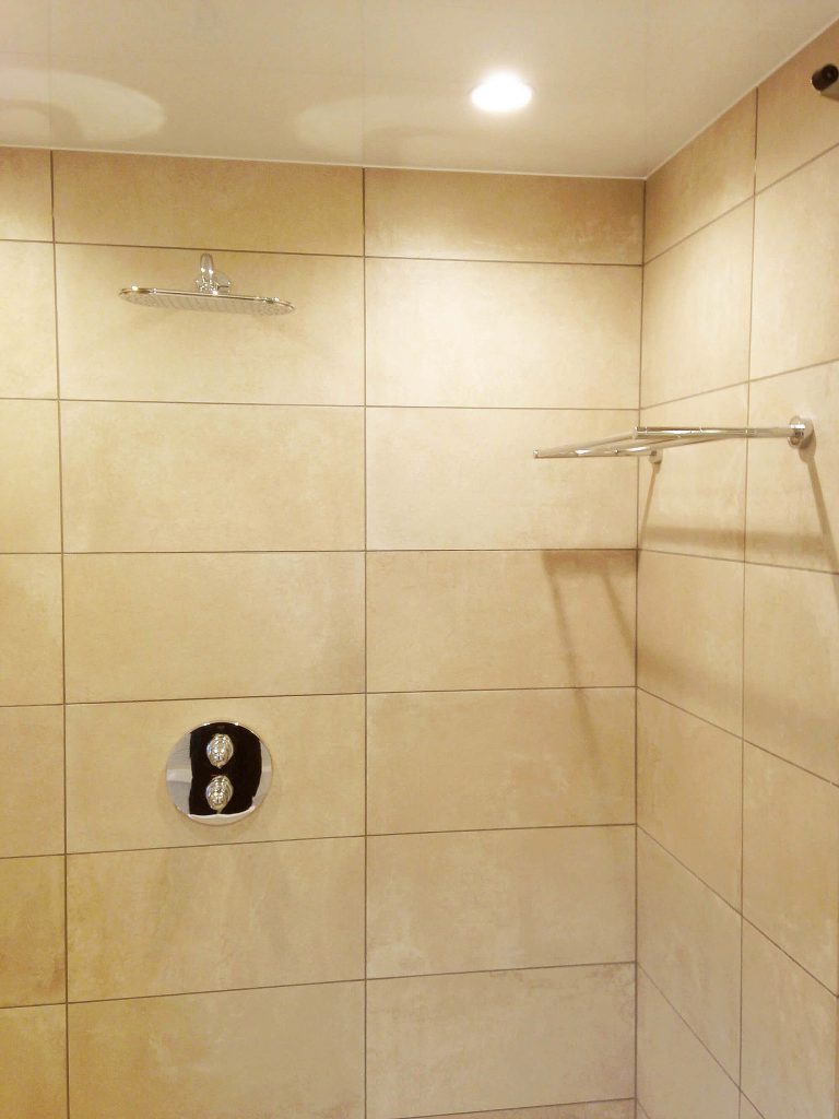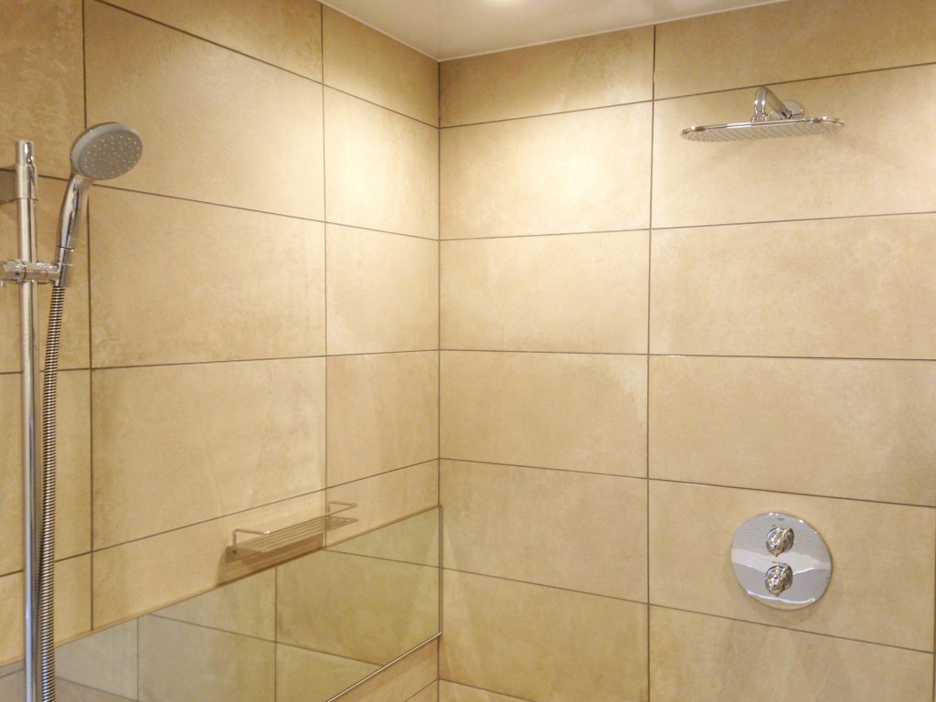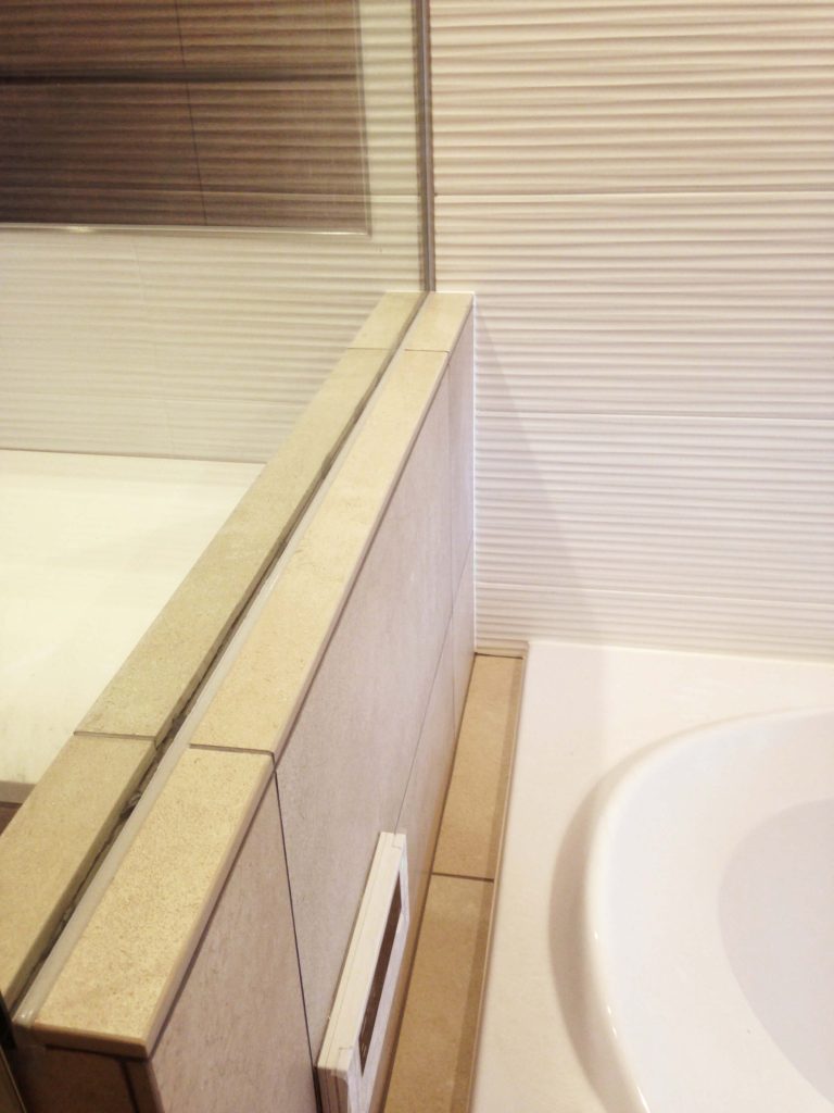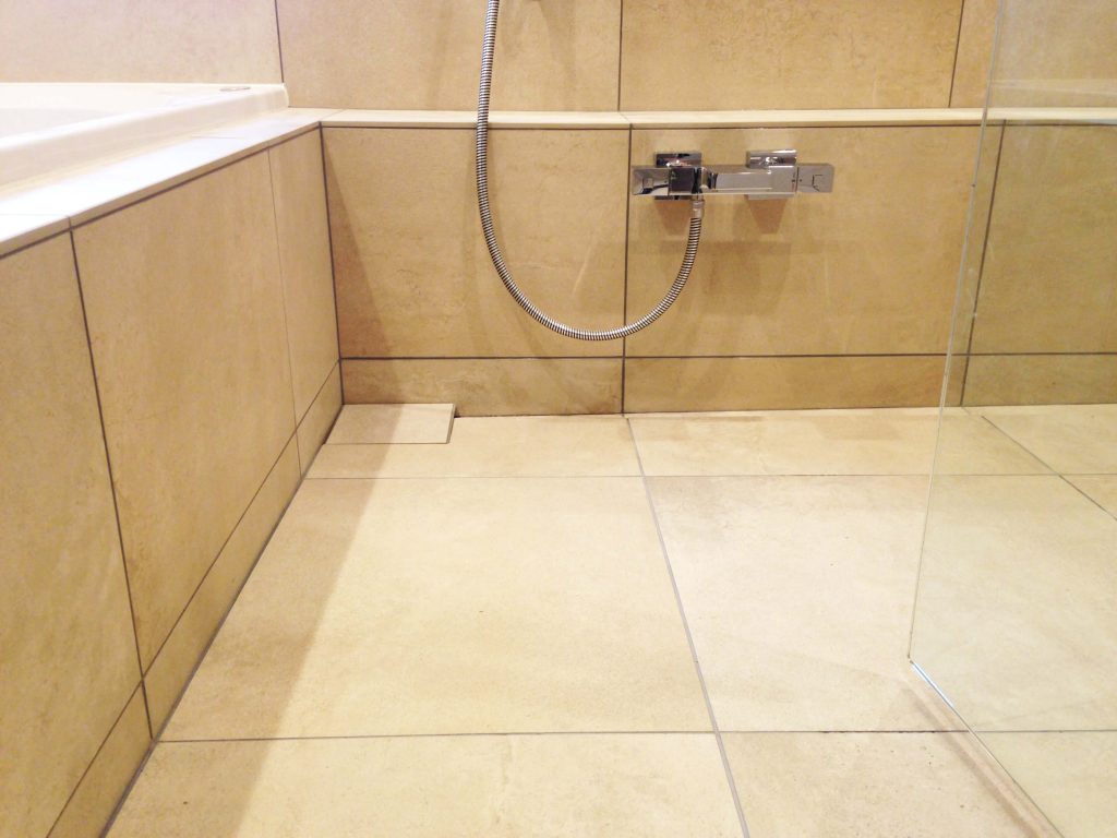 大判タイルの面の美しさと静かな奥行きに包まれ、ゆるやかに時が流れる、落ち着きあるバスルーム